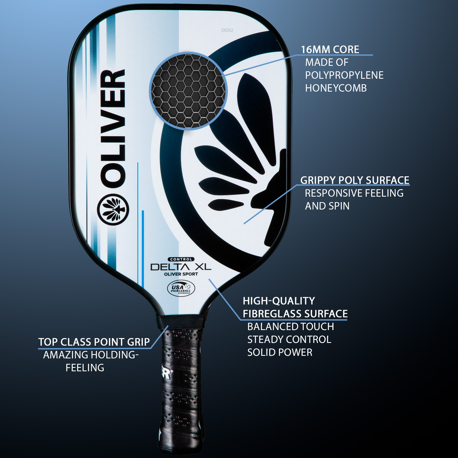 ✔️Fiberglass Surface with Poly Finish for Extra Power and Spin: The fiberglass surface combined with a grippy poly finish offers exceptional power and spin. This combination makes the DELTA XL Control a versatile all-round paddle, perfect for both offensive and defensive play styles.